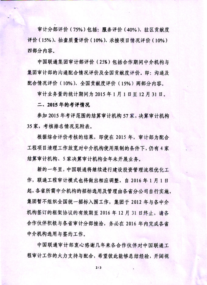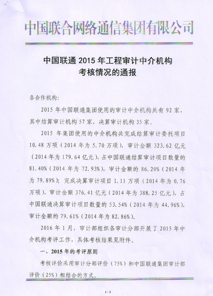 | 關于中國聯通2015年工程審計中介機構考核情況的通報 | |