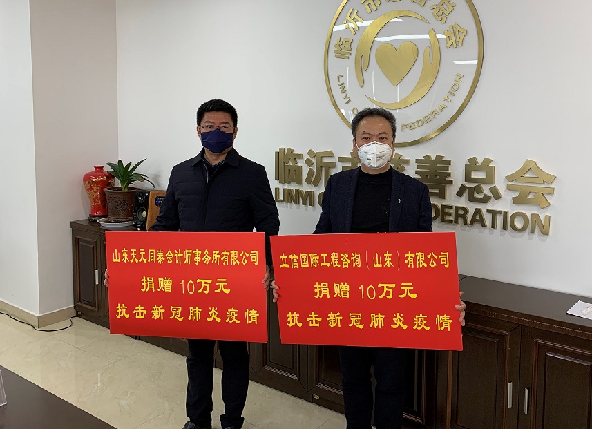 防控疫情,人人有責。在抗擊新冠肺炎關鍵時期,全體同泰人與全國人民同呼吸、共命運,特向臨沂市慈善總會捐款專項用于防控新冠肺炎,以表達同泰人疫情面前共擔當的決心和信心。其中山東天元同泰會計師事務所臨沂分所捐款10萬元,立信國際工程咨詢(山東)有限公司捐款10萬元,合計20萬元整。 用愛戰疫,共克時艱?!巴庇米约旱男袆訁⑴c到這場戰役中,以聚沙成塔、聚光為星的信念為一線防疫工作提供支持。我們堅信在各級黨委、政府的堅強領導下,全國人民萬眾一心、眾志成城,我們有信心、有決心、有能力一定能夠打贏這次疫情防控阻擊戰! 武漢加油!中國加油!