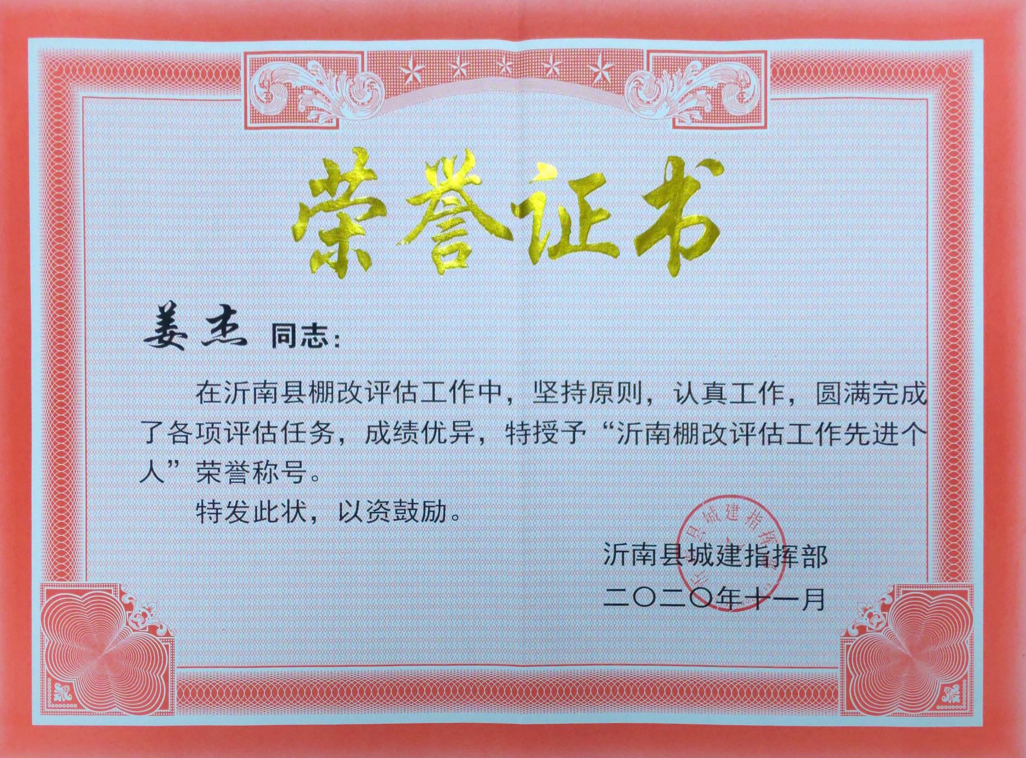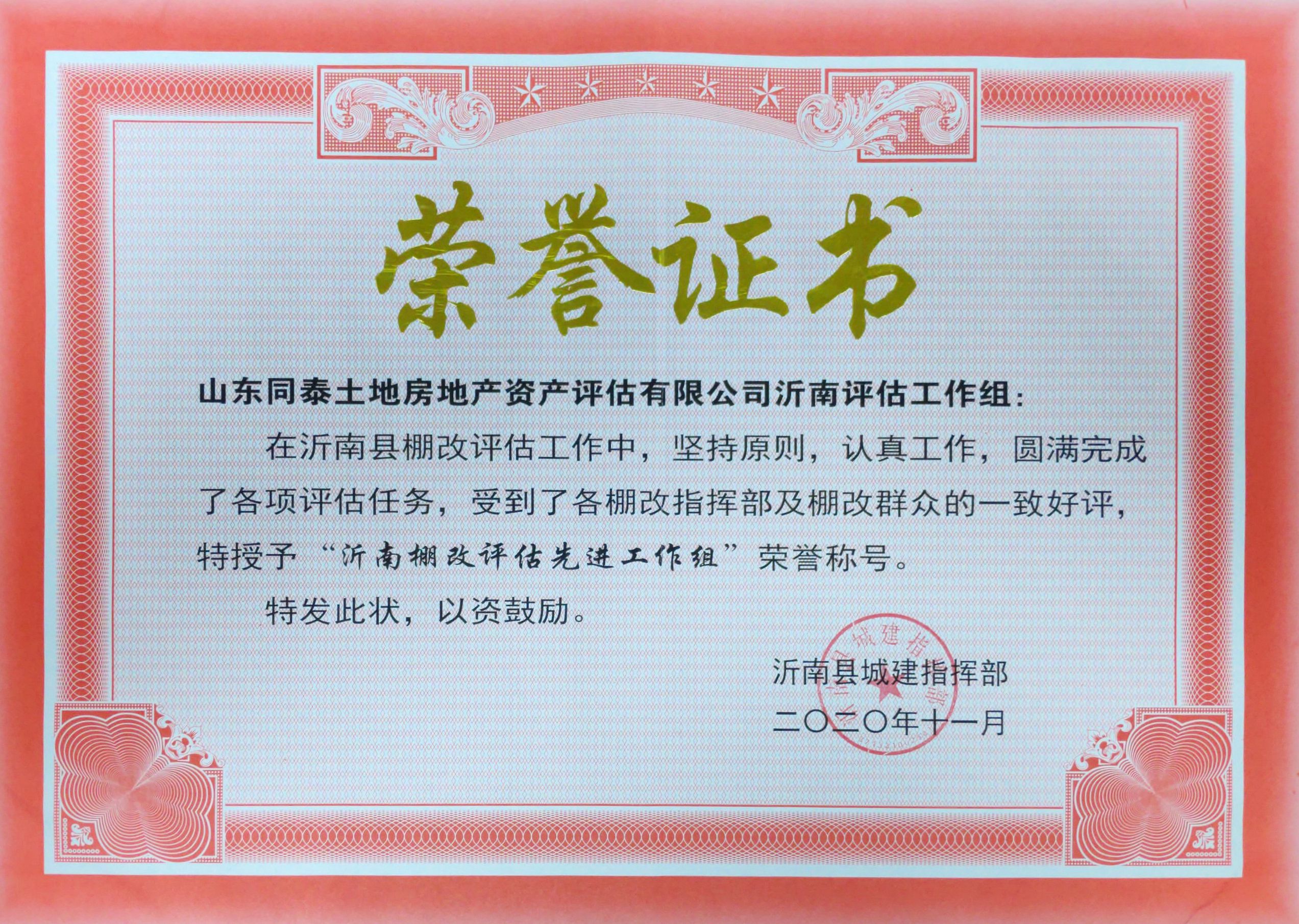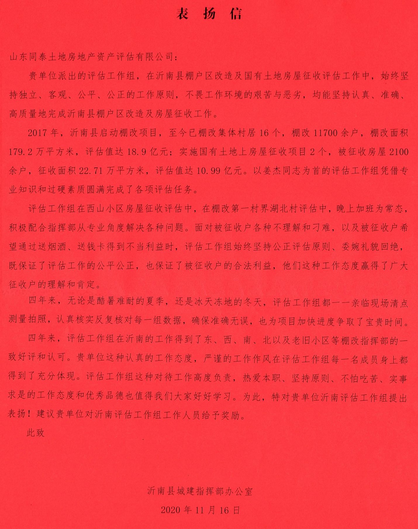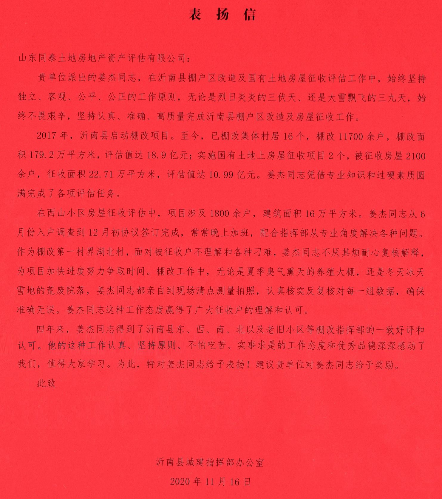 近日,沂南縣城建指揮部對在沂南縣棚戶區改造及國有土地房屋征收評估工作中做出突出貢獻的單位和個人提出表揚,山東同泰土地房地產資產評估有限公司派出的評估組獲得“沂南棚改評估先進工作組”榮譽稱號,公司評估師姜杰獲得“沂南棚改評估工作先進個人”榮譽稱號,榮譽證書、表揚信全文如下: