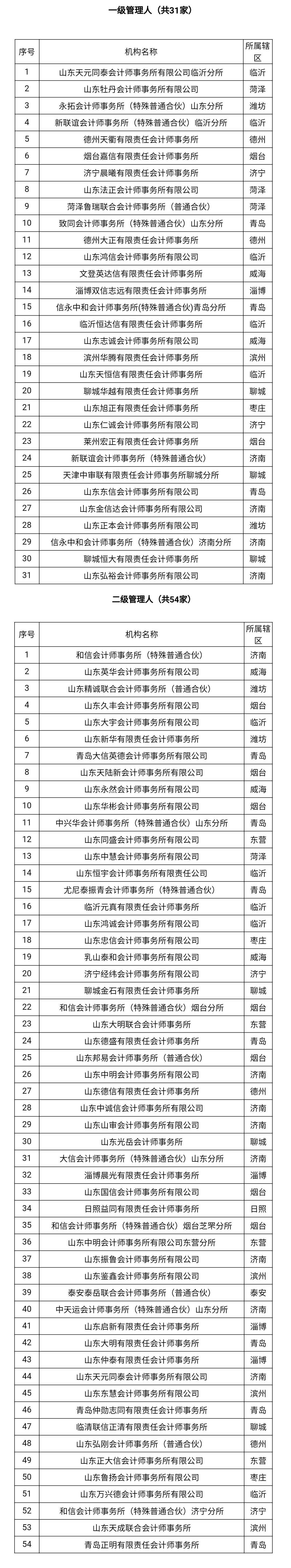 2月26日,山東省高級人民法院向社會公布了企業破產案件管理人初審名冊。初審名冊中的機構管理人分為兩級,我省行業入冊機構85家,其中一級管理人31家,二級管理人54家。自編制企業破產案件管理人名冊的通知下發以來,協會積極與山東省高院、地方中院及破產管理人協會等多方協調,努力爭取注冊會計師行業話語權,多種途徑宣傳并全力配合會計師事務所辦理申報入冊事項?,F將入冊會計師事務所名單列示如下(個人管理人略):