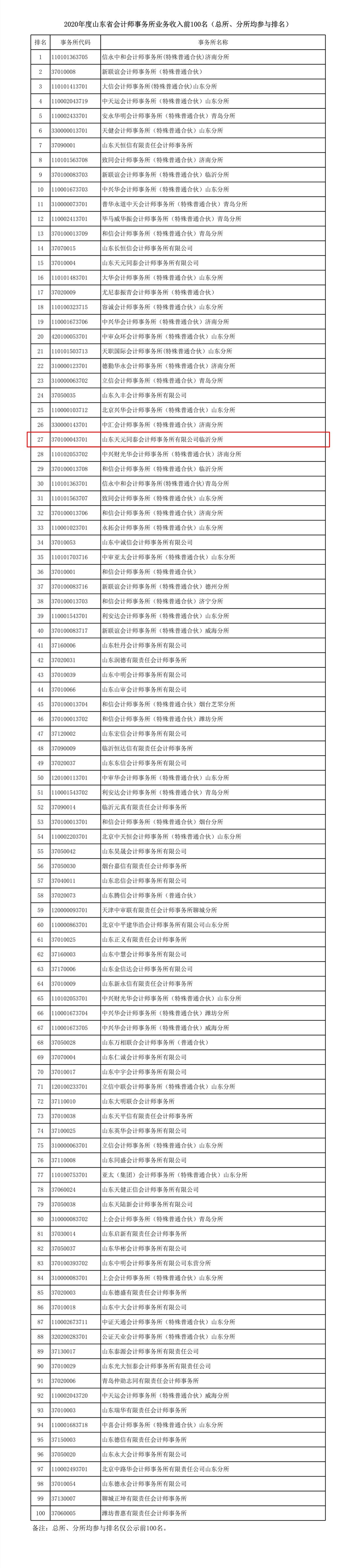 原文鏈接:2020年度山東省會計師事務所業務收入前100名(總所、分所均參與排名) (sdicpa.org.cn)